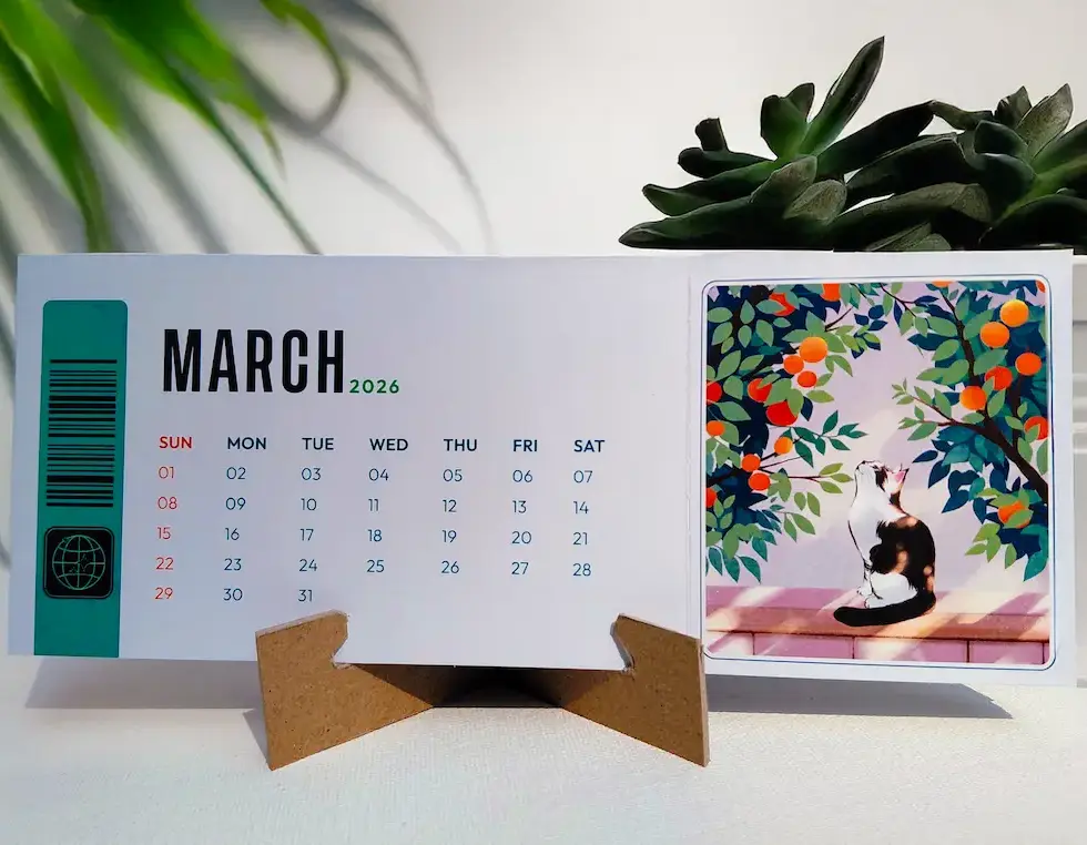 Meet your new favorite desk companion, the 2026 Ticket-Style Cat Calendar (comes with a cardboard stand to hold all the tickets together), where every month feels like a tiny adventure.